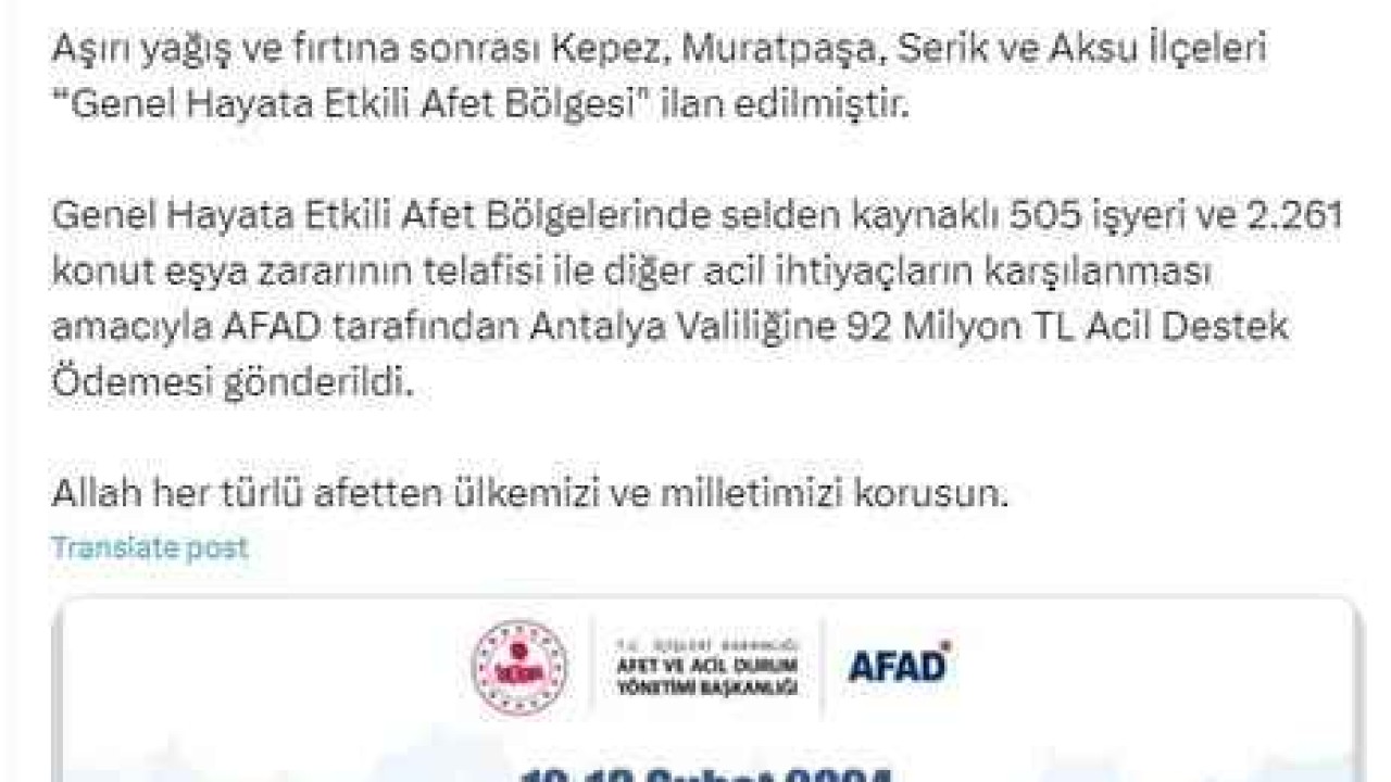 Antalya'nın Kepez, Muratpaşa, Serik ve Aksu ilçeleri, 12 ve 13 Şubat tarihlerinde yaşanan şiddetli yağışlar ve fırtına nedeniyle meydana gelen sel ve su baskınları sebebiyle 'Acil Durum Afet Bölgesi' olarak ilan edildi. Bu duyuru, İçişleri Bakanı Ali Yerlikaya tarafından yapıldı. Yerlikaya, sosyal medya üzerinden yaptığı açıklamada, bu ilçelerdeki 505 iş yeri ve 2.261 konutun sel nedeniyle zarar gördüğünü ve zararların giderilmesi, acil ihtiyaçların karşılanması için AFAD'ın Antalya Valiliği'ne 92 Milyon TL tutarında Acil Destek Ödemesi sağlandığını belirtti.