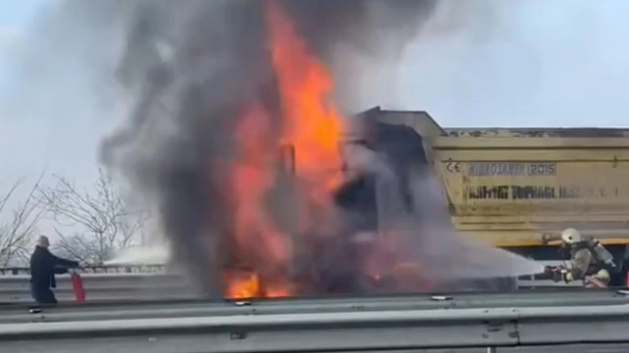 Düzce'de damperli kamyon, fren balatalarının tutuşması sonucu alev topuna döndü. Yangının hızla yayılmasına rağmen itfaiye ekipleri duruma müdahale ederek büyük bir felaketin önünü aldı.