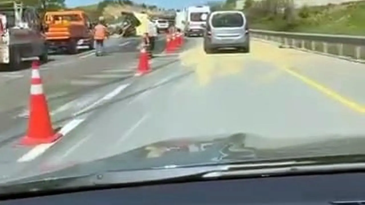 Sakarya'nın Kaynarca ilçesinden geçen D020 karayolunda endişe verici bir trafik kazası meydana geldi. Adapazarı istikametinden Kaynarca yönüne seyir halinde olan yem yüklü bir silobas tır, sürücüsünün direksiyon hakimiyetini kaybetmesi sonucu kontrolden çıkarak devrildi. Kaza nedeniyle silobas içerisindeki tonlarca hayvan yemi yola savrulurken, bölgede ulaşım bir süreliğine aksadı ve trafik kontrollü olarak sağlandı.