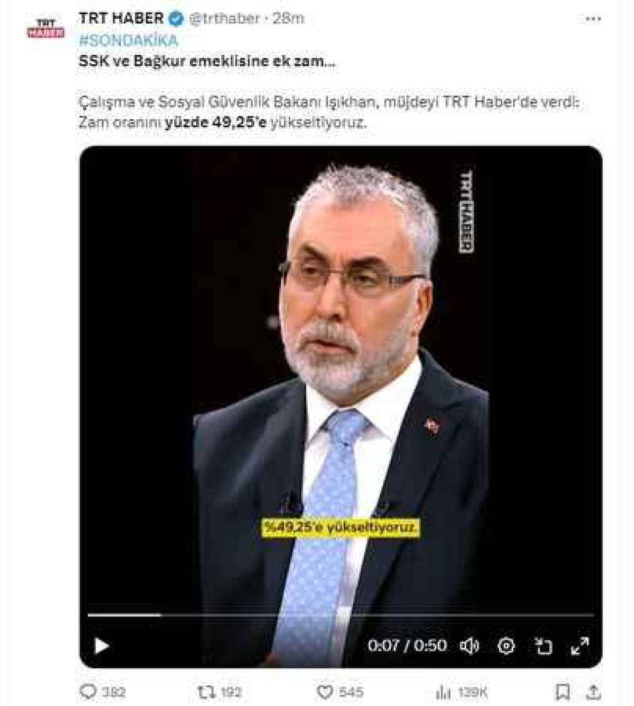 Bakan Işıkhan, 13,5 milyon SSK ve Bağ-Kur emeklisine müjde vererek, Ocak 2024 itibarıyla emekli aylıklarındaki artışın yüzde 49,25'e yükseltildiğini belirtti. Bu artışla tüm emeklilerin aynı oranda zam almasının sağlandığını vurguladı. Bakan, Ocak 2024'ten itibaren ilk 6 ay için tüm emeklilere aynı oranda artış yapılacağını ve bu durumun tüm emekliler için hayırlı olmasını diledi. Ayrıca, Ocak ve Temmuz aylarında emeklilerin aylıklarının artacağını, Temmuz ayında memurlar için toplu sözleşme ve SSK ile Bağ-Kur emeklileri için mevzuat çerçevesinde emekli aylıklarının artacağını belirtti. Resmi Gazete'de yayımlanan teklif sonrası oluşan aylık farkların 1 hafta içinde ödeneceğini de ekledi.