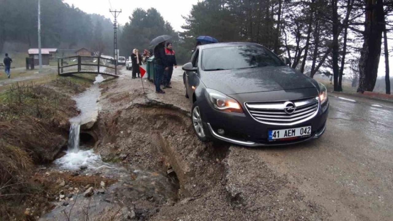 Bolu’da Abant Gölü Milli Parkına gelen ailenin içinde bulunduğu otomobil, park edildiği sırada şarampole devrilmekten son anda kurtuldu. Sel nedeniyle bozulan yolda otomobil askıda kaldı.