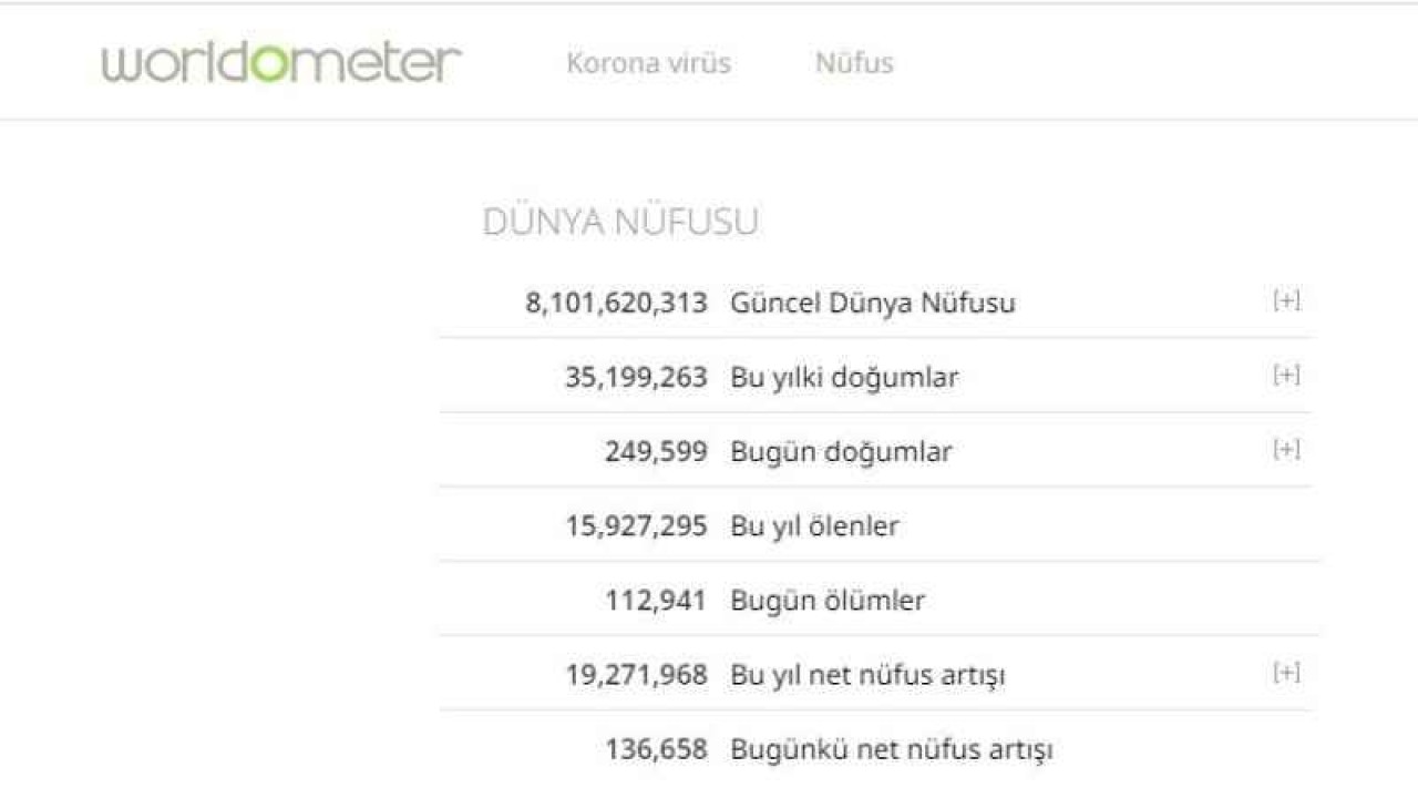 | Dünya Nüfusu | Güncel Nüfus | Kişi | 8,101,620,033 |