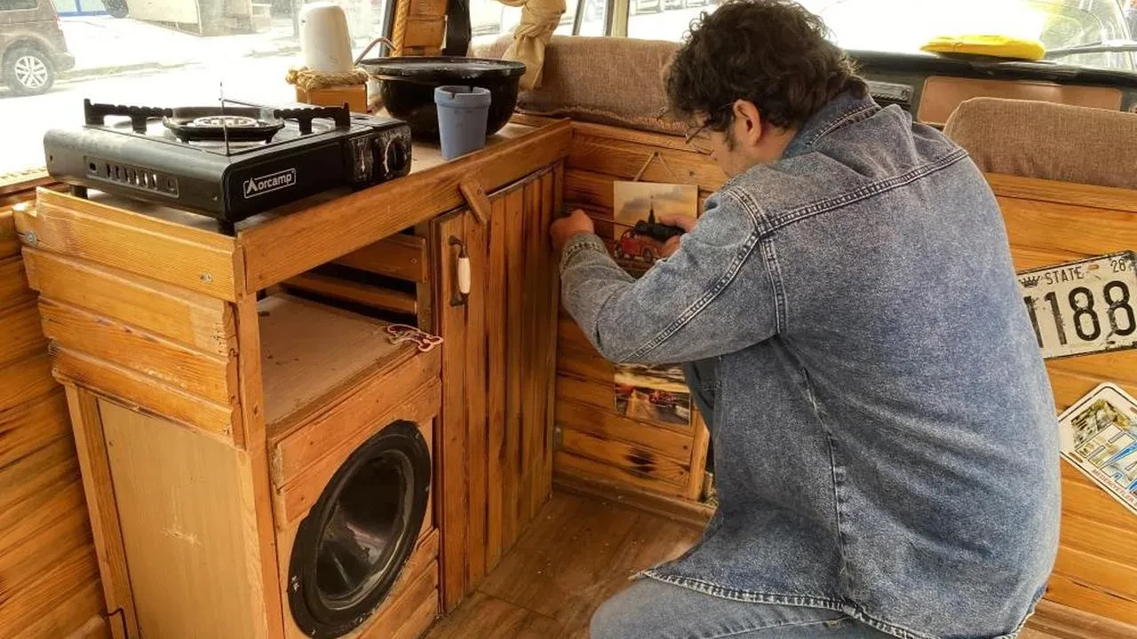 Aracın içindeki çalışmaların henüz tamamlanmadığını belirten Soyalan, "Perdeler takılacak ve raf yapılacak. Kitaplığı bile var. Kahveleri ve çaydanlığı koymak için ayrıca raf olacak. Koltuğu açılıp kapanıyor. Onun dışında, yaşam aküsü bulunuyor. Bütün elektriği 220 volta çeviriyor," dedi. Tüm bu düzenlemeleri arkadaşıyla birlikte el emeğiyle yaptıklarını vurgulayan Soyalan, ustaya hiç iş yaptırmadıklarını, tahtaları, döşemeleri ve parkeleri kendilerinin kesip döşediklerini aktardı.