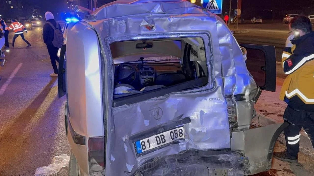 Düzce’de kırmızı ışıkta bekleyen hafif ticari araç, alkollü bir kamyon sürücüsünün kontrolsüz çarpması sonucu ağır hasar aldı. Kazada üç kişi yaralandı. Olay anı başka bir aracın kamerasına yansıdı.
