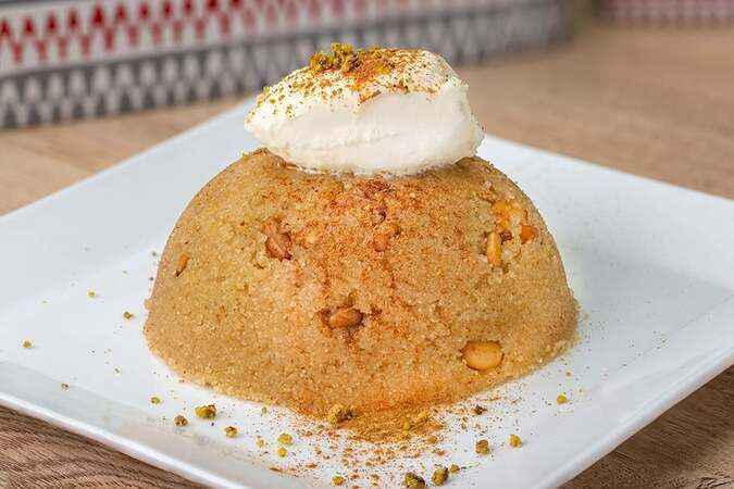 5. Hazırladığınız irmik helvasını servis tabağına alın ve üzerine çiğ badem veya ceviz ile süsleyerek servis yapın.