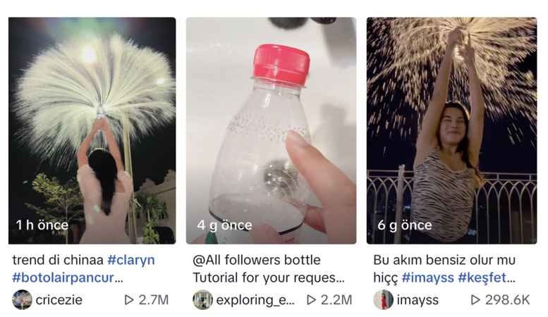 Bu akım, su şişelerinden elde edilen havai fişek görünümlü görüntülerin kaydedilmesiyle ortaya çıkıyor. Tiktok kullanıcıları, şişelerindeki suyu yüksek basınçla püskürterek renkli, ışıltılı görüntüler elde ediyor.