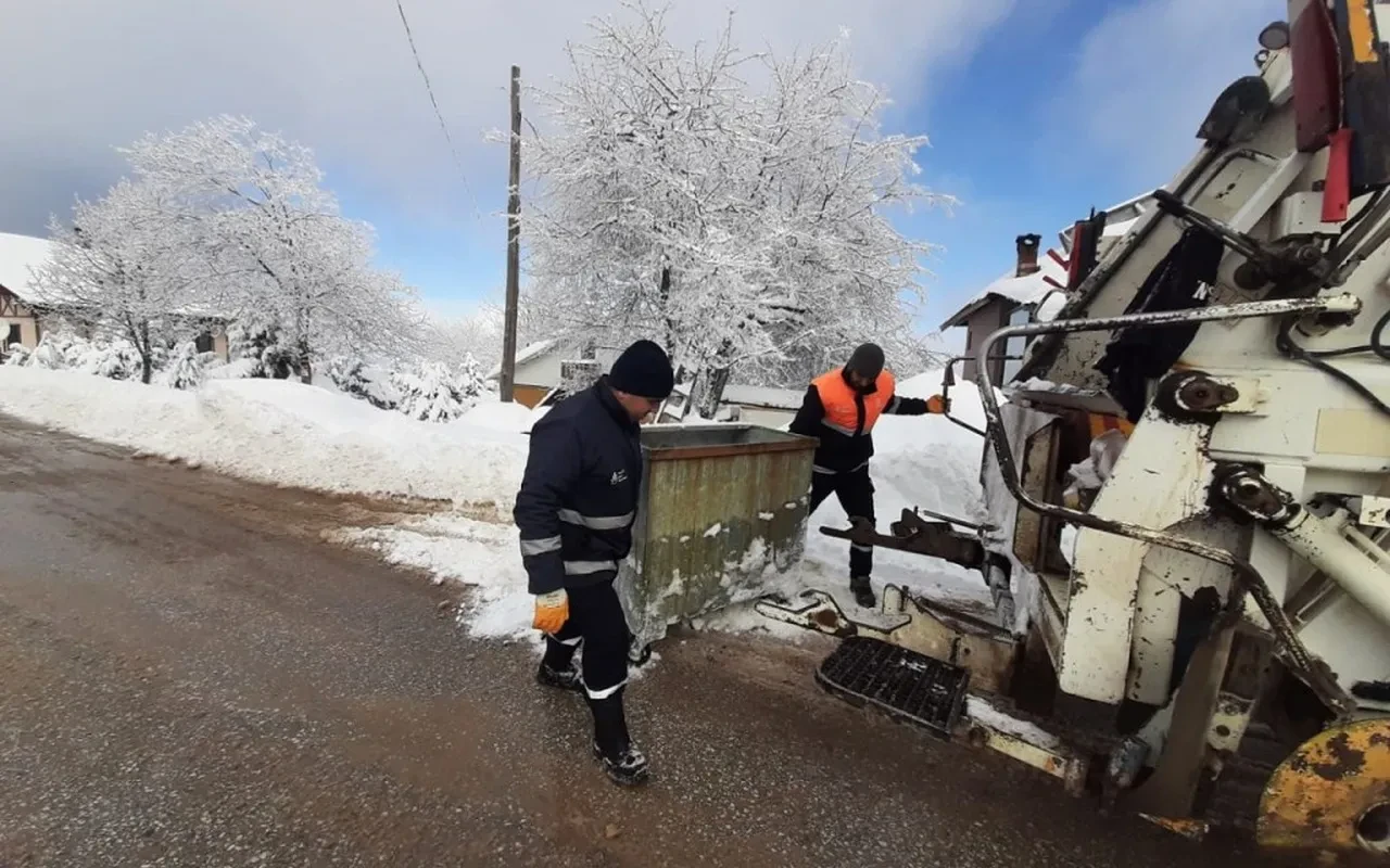 Temizlik ekipleri kırsal bölgelerdeki çöp konteynerlerini boşaltıyor. Kar altında kalan çöpler hızla toplanıyor.