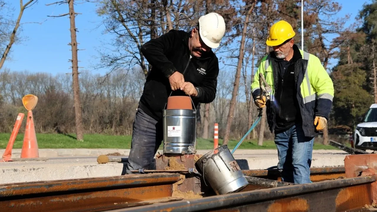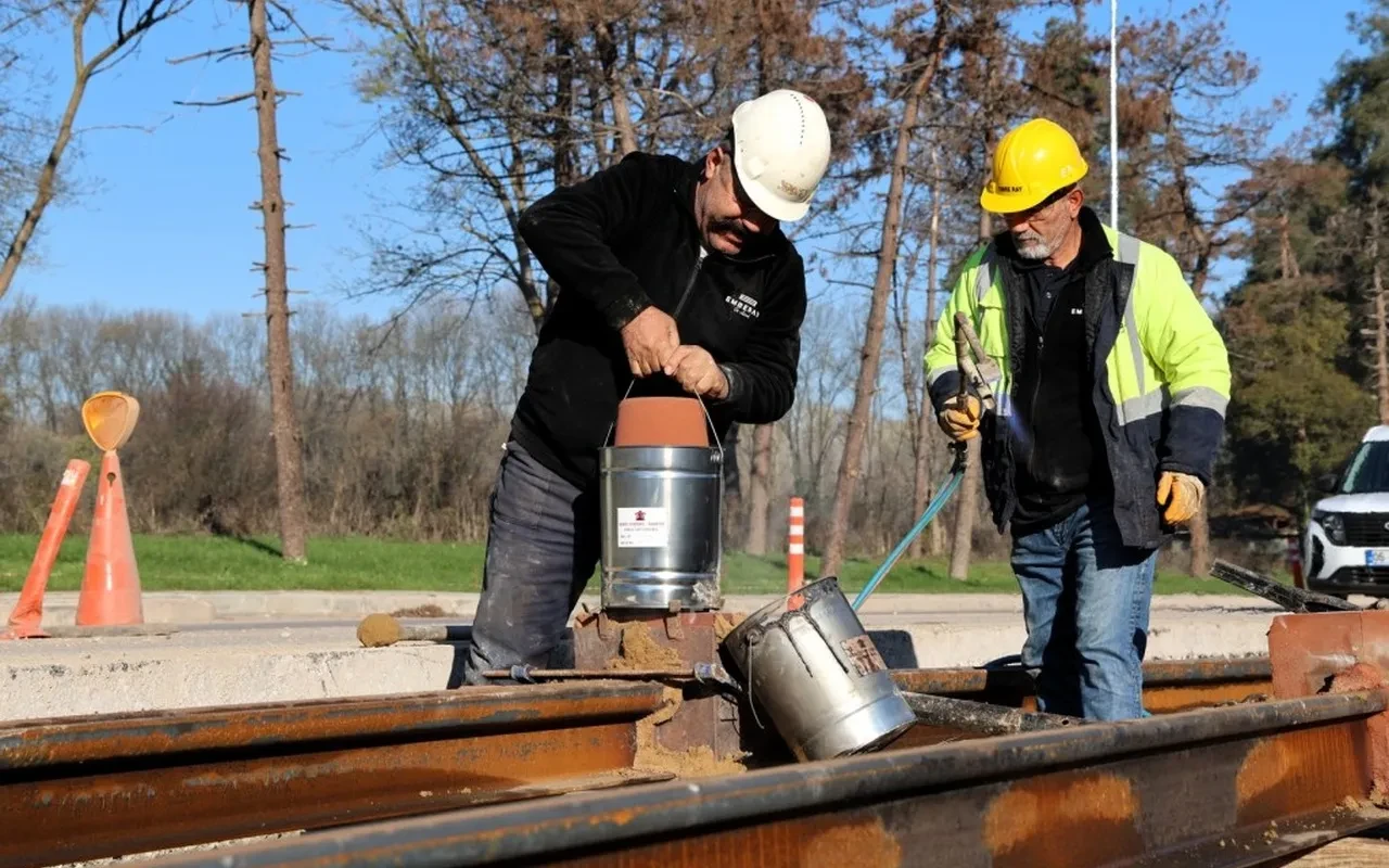 Vatan Caddesi'nden Bağımsızlık Caddesi'ne kadar döşenen raylar birleştiriliyor. Alüminotermit kaynağı ile sabitlenme işlemi yapılıyor.