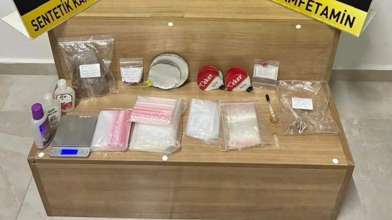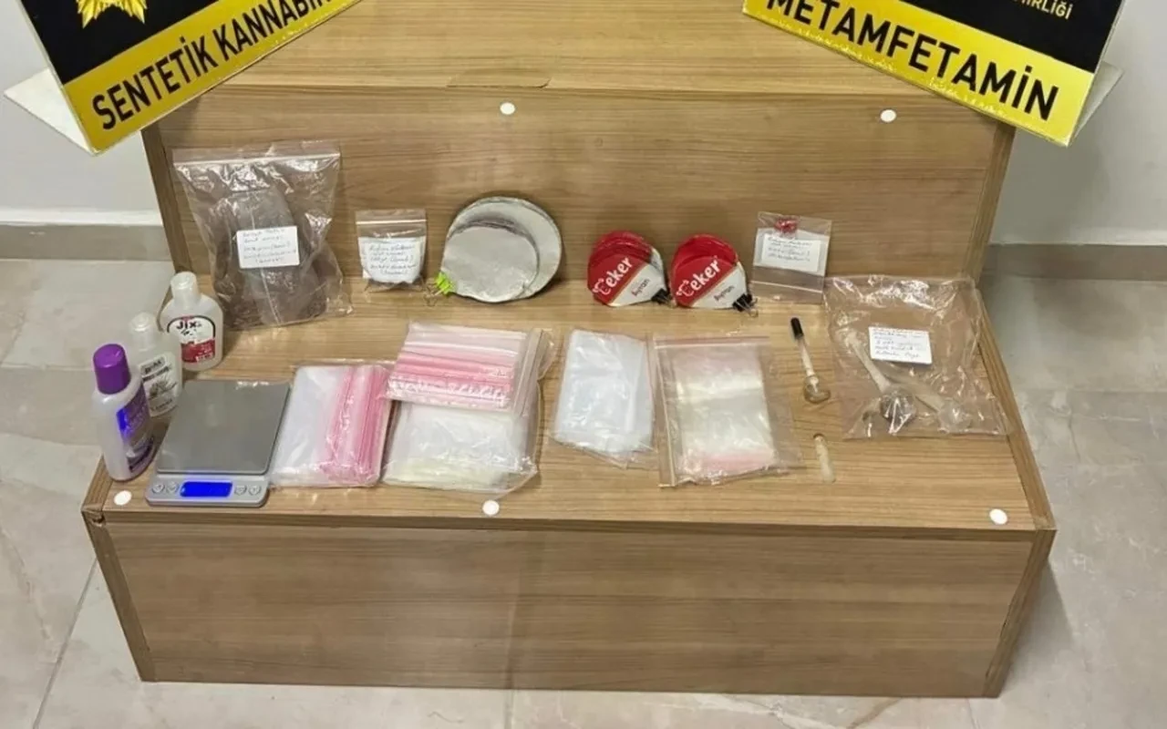 Operasyon kapsamında 1 kilo 156 gram sentetik kannabinoid ve 3 gram metamfetamin bulundu. Hassas terazi de ele geçirilen eşyalar arasında yer aldı.